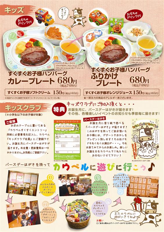 お子様に大人気「キッズプレート」。地元の卵と牛乳から作った、カウベルオリジナルプリンとソフトクリームは食べた人が皆、自然と笑顔になる美味しさです。