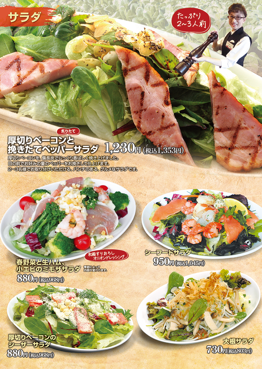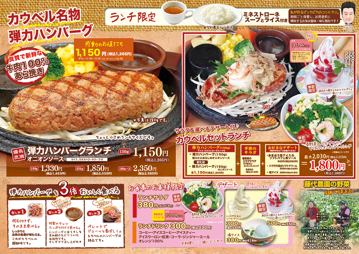 「弾力バーグが最高に美味しく食べられるお店」をコンセプトとした みつわ台店グランドメニューをご紹介 ※メニュー画像をクリックすると拡大表示されます。