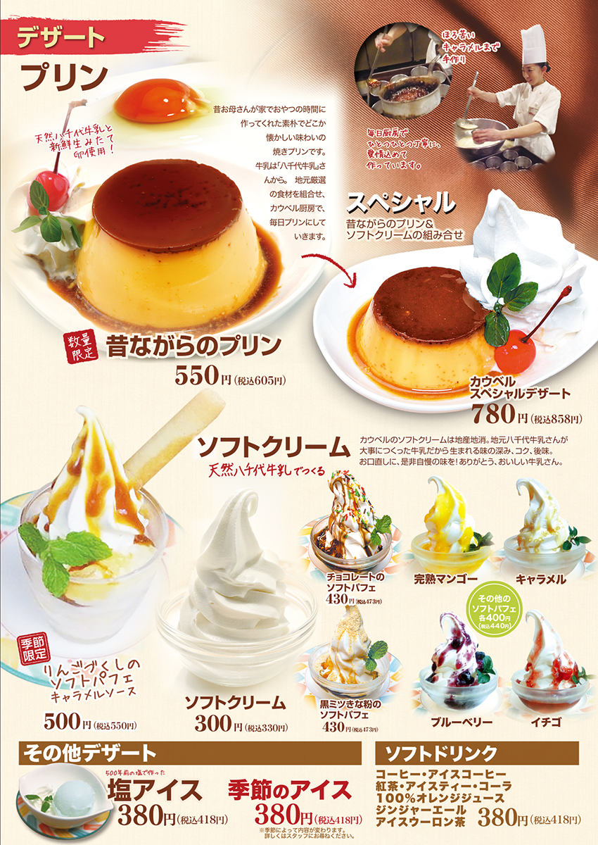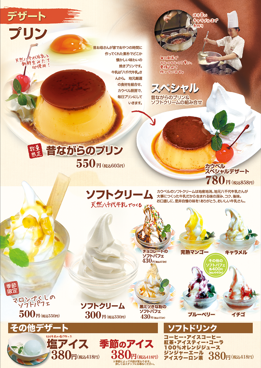 お子様に大人気「キッズプレート」。地元の卵と牛乳から作った、カウベルオリジナルプリンとソフトクリームは食べた人が皆、自然と笑顔になる美味しさです。