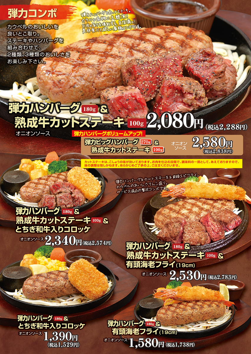 カウベルのおいしいを良いとこ取り。ステーキやハンバーグを組み合わせて、2種類、3種類のおいしさをお楽しみ下さい。