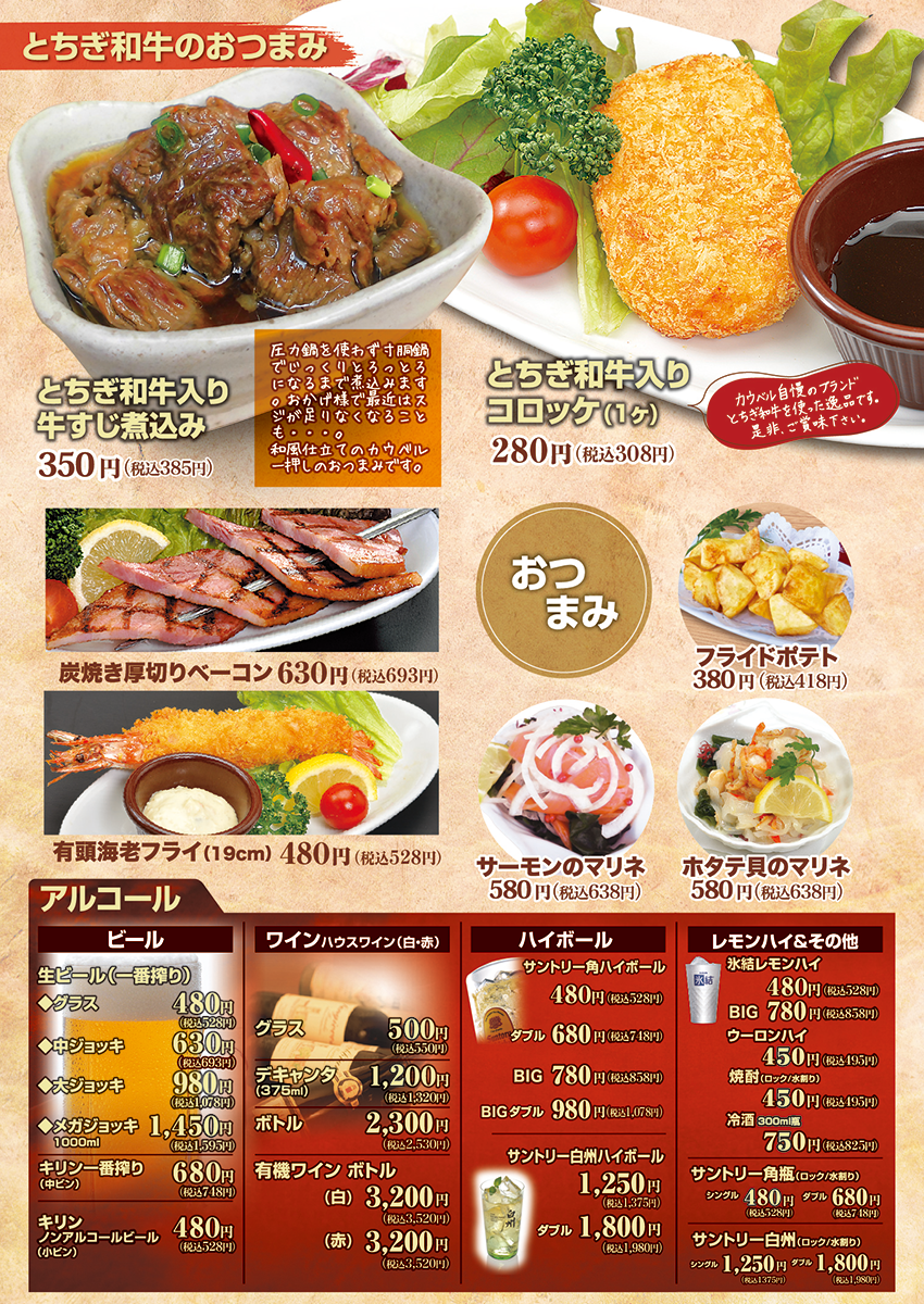 契約農園から届く、無農薬有機栽培の野菜を使用。カウベル自慢のとちぎ和牛を使ったおつまみも絶品です。